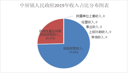中屏镇人民政府2019年度收入合计2884.24万元。其中:财政拨款收入2152.64万元,占总收入的74.63%;政府性基金预算财政拨款收入731.6万元,占总收入的25.37%;上级补助收入0万元,占总收入的0%;事业收入0万元(含教育收费0万元),占总收入的0%;经营收入0万元,占总收入的0%;附属单位缴款收入0万元,占总收入的0%;其他收入0万元,占总收入的0%。与上年对比减少632.84万元,主要原因分析:2019年项目相较于2018年有所减少。
