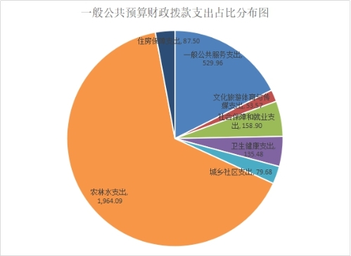 6. 农林水支出1964.09万元,占一般公共预算财政拨款总支出的65.27%。主要用于:农业事业运行经费208.99万元;林业事业机构经费80.17万元;水利水土保持56.22万元;扶贫(农村基础设施建设、生产发展、扶贫贷款奖补和贴息)476.25万元;其他扶贫支出159.8万元;对村级一事一议的补助619.32万元;对村民委员会和村党支部的补助362.38万元;其他农林水支出0.97万元;