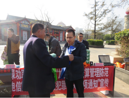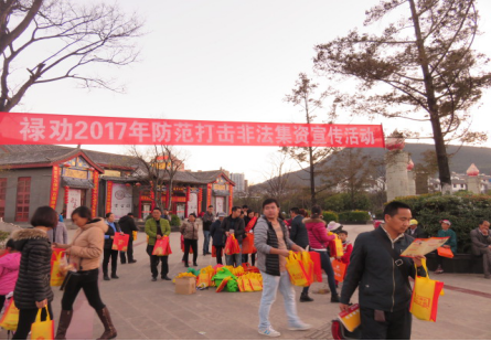 1月22日,抓住春节返乡人员增多,群众大多外出购买年货的有利时机,县财政局(金融办)牵头,联合县公安局经侦大队、县司法局、县文广局、人民银行禄劝支行、县银监办、辖区内农信社、农行等5家银行、方正证券公司,在县城民族文化广场开展以 “拒绝高利诱惑,远离非法集资” 为主题的防范和打击非法集资宣传活动。活动现场,通过播放宣传短片、发放宣传资料、现场讲解等形式,着力宣传“非法集资不受法律保护、参与非法集资风险自担”,向过往群众介绍非法集资的主要特征、表现形式和常见手段,提醒广大群众对“高额回报”、“快速致富”的非法集资要擦亮眼睛,提高警惕,引导广大群众深刻认识非法集资的社会危害性,远离非法集资,进一步提高了群众防范风险的警惕性。活动当天,共发放宣传单、宣传环保袋、普法扑克、春联、抽纸等宣传资料5000余份,接受群众现场咨询100余人次。县财政局(金融办)将继续把防范打击非法集资宣传教育作为我县加强法治金融建设、优化金融生态环境的一项基础性工作抓好抓实,为打击和处置非法集资工作营造良好舆论环境。(县金融办供稿)
