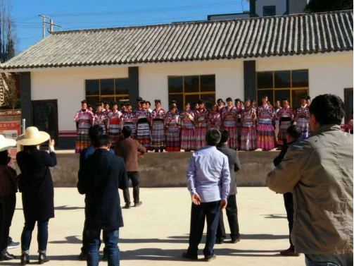 在考察组一行进入大松园村文化活动场所时,现场苗族文艺队唱起了红歌,跳起了蹲转舞,向考察组展示了易地搬迁集中安置点群众良好的精神风貌和丰富的文化生活,获得了焦林书记、考察组及现场领导的好评。易地搬迁集中安置点的公共文化服务工作,完善文化室的软硬件设施,下派工作人员指导当地文化室、文化队伍规范有序的进行文化活动,保障易地搬迁集中安置点群众的文化权益,是县文体广电旅游局的重要工作。