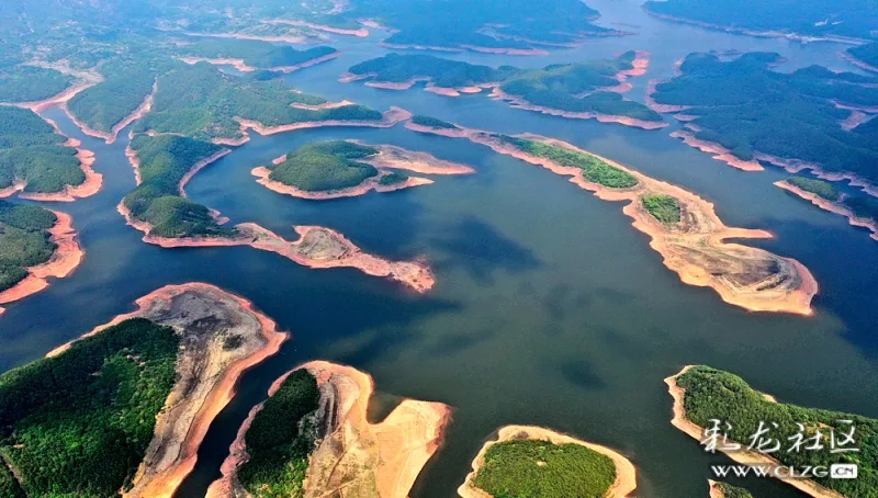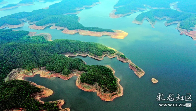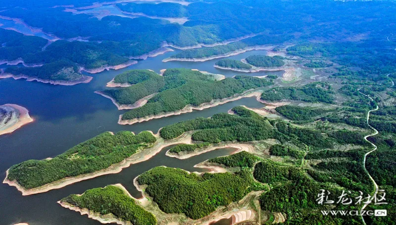 空中眺望,一池碧波映入眼帘。湖水清幽,碧波荡漾,湖中群岛绿意盎然,山水相依。