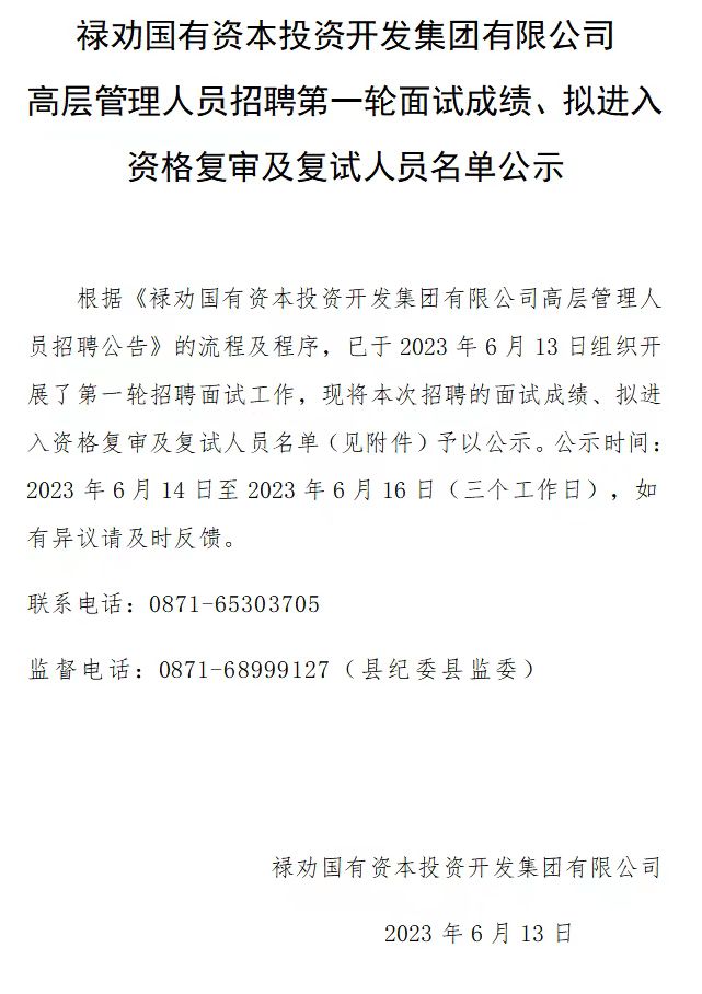 禄劝国有资本投资开发集团有限公司高层管理人员招聘第一轮面试成绩 拟进入资格复审及复试人员名单