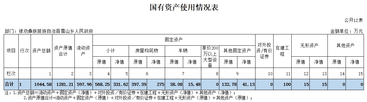 截至2023年末,禄劝彝族苗族自治县雪山乡人民政府资产总额1044.58万元,其中,流动资产597.96万元,固定资产331.62万元(净值),对外投资及有价证券0万元,在建工程100万元,无形资产15万元(净值),其他资产0万元(净值)(具体内容详见附表)。与上年相比,本年资产总额减少234.69万元,其中固定资产增加11.16万元。处置房屋建筑物0平方米,账面原值0万元;处置车辆0辆,账面原值0万元;报废报损资产0项,账面原值0万元,实现资产处置收入0万元;出租房屋0平方米,账面原值0万元,实现资产使用收入0万元。