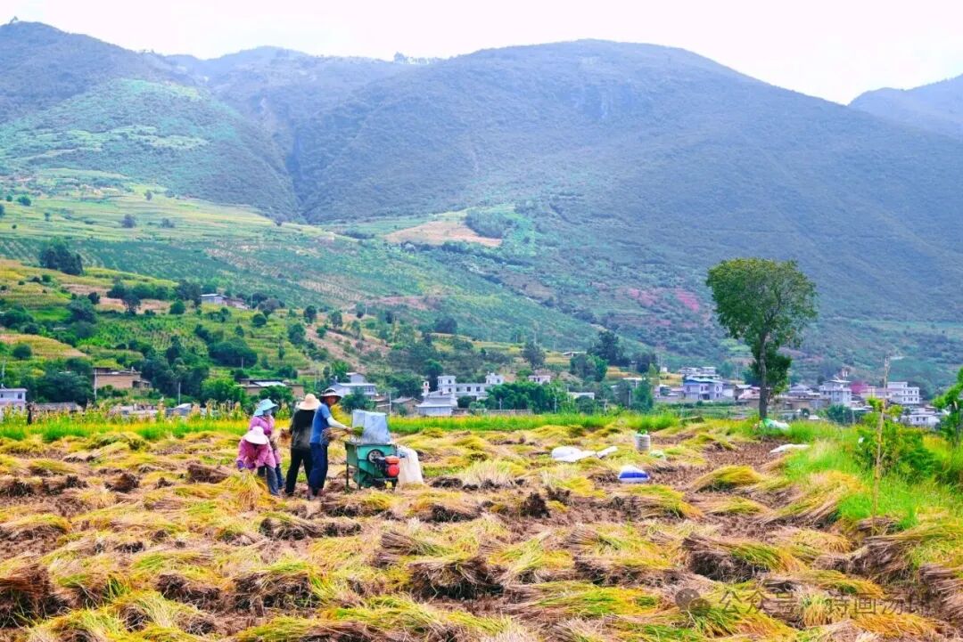 金沙江蜿蜒而过的河谷平原,是汤郎乡水稻的主产区。农户们握着代代相传的镰刀,刀刃在晨光中划出银弧,稻秆应声而倒,沉甸甸的稻穗压弯了稻农的脊背。