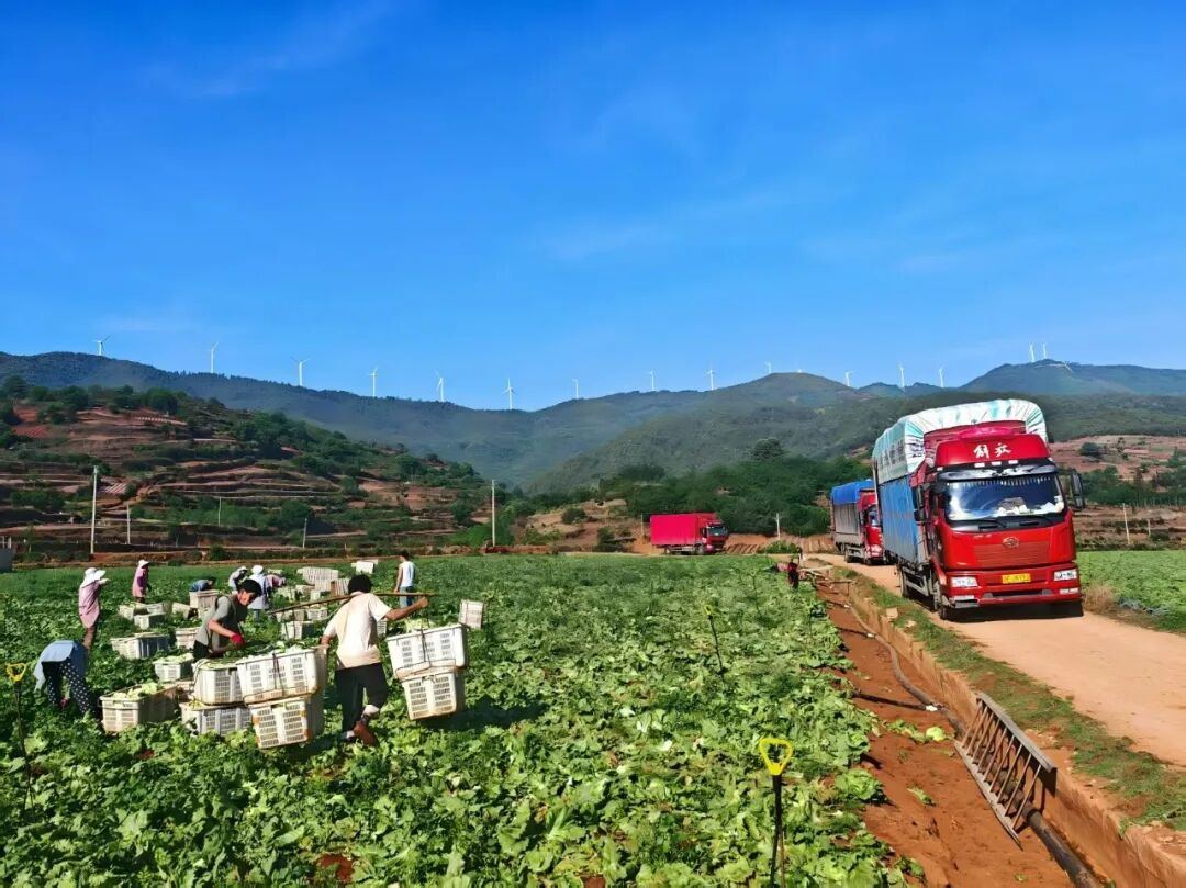走进洗马河畔的千亩蔬菜基地,翠绿的生菜、紫亮的甘蓝、饱满的松花菜等蔬菜郁郁葱葱、长势喜人,村民们穿梭在田间,娴熟地采摘、分拣、装箱,一辆辆冷链运输车整装待发,将这份来自大自然的生态馈赠送往昆明、重庆、广州等地。