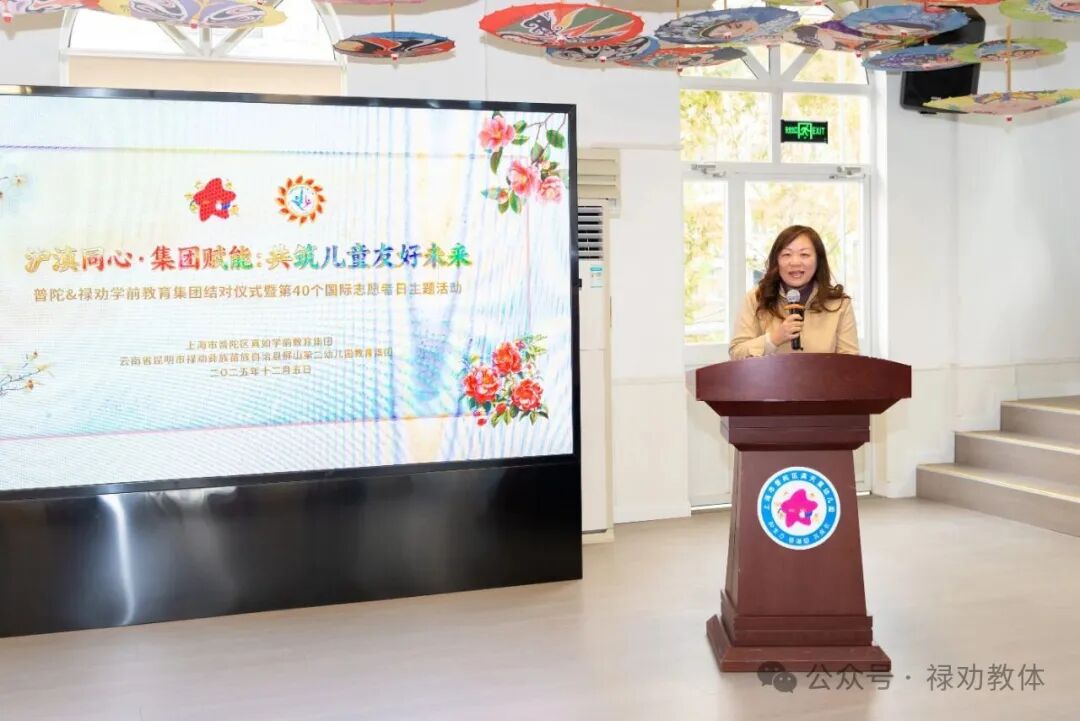12月5日,上海市普陀区真如学前教育集团与禄劝县屏山第二幼儿园教育集团跨越千里、云端相聚,以线上方式举行了“沪滇同心·集团赋能:共筑儿童友好未来”结对仪式暨主题日活动,上海市普陀区教育局学前科科长、真如学前教育集团理事长,禄劝县教体局教育科、局办公室等相关负责人参加活动。