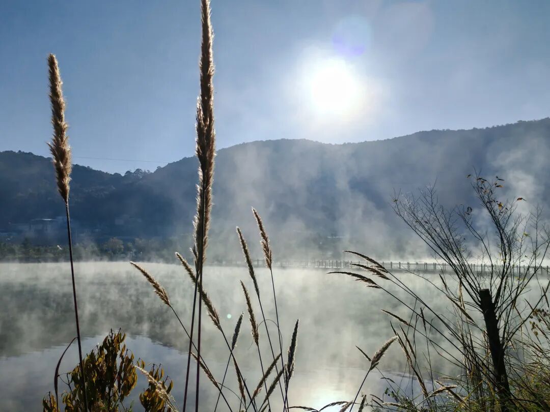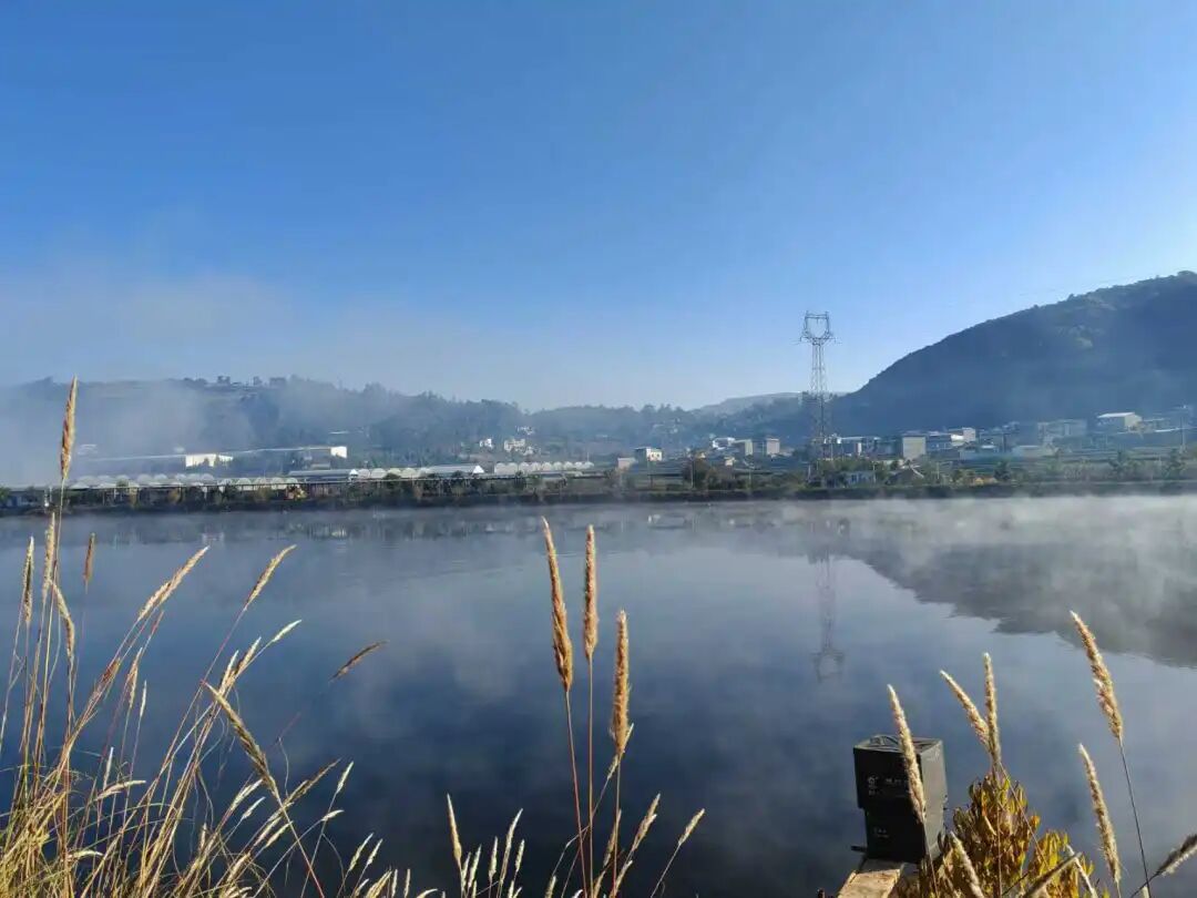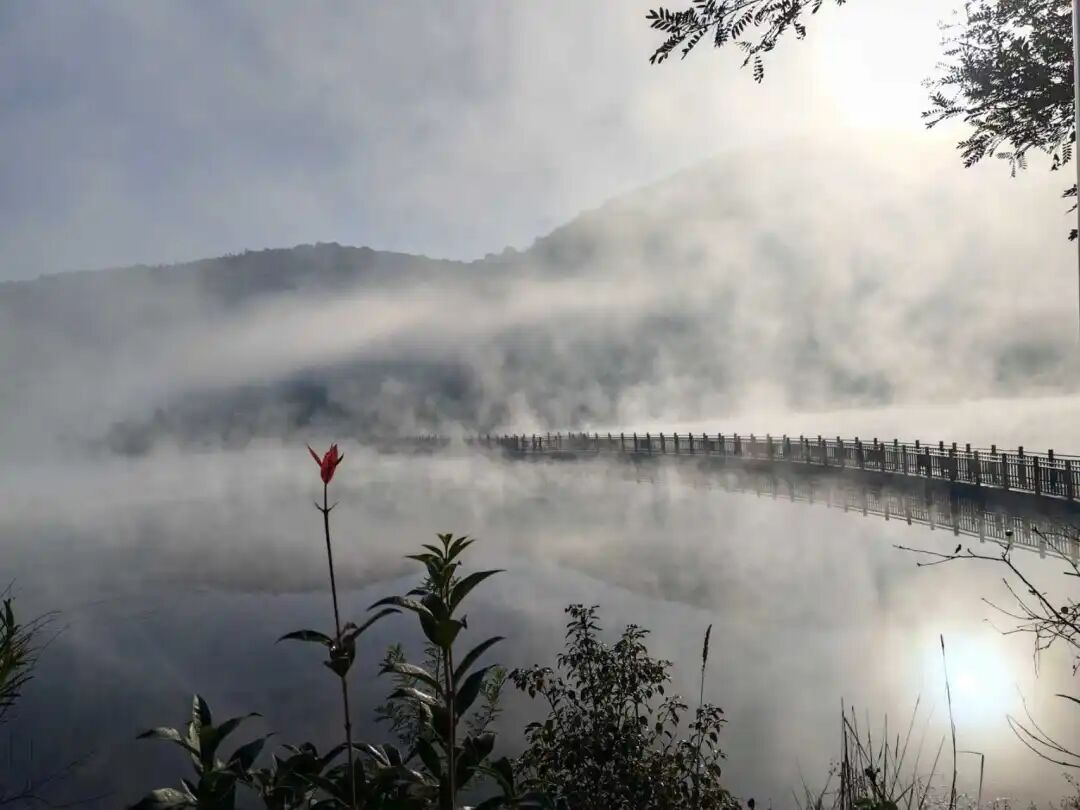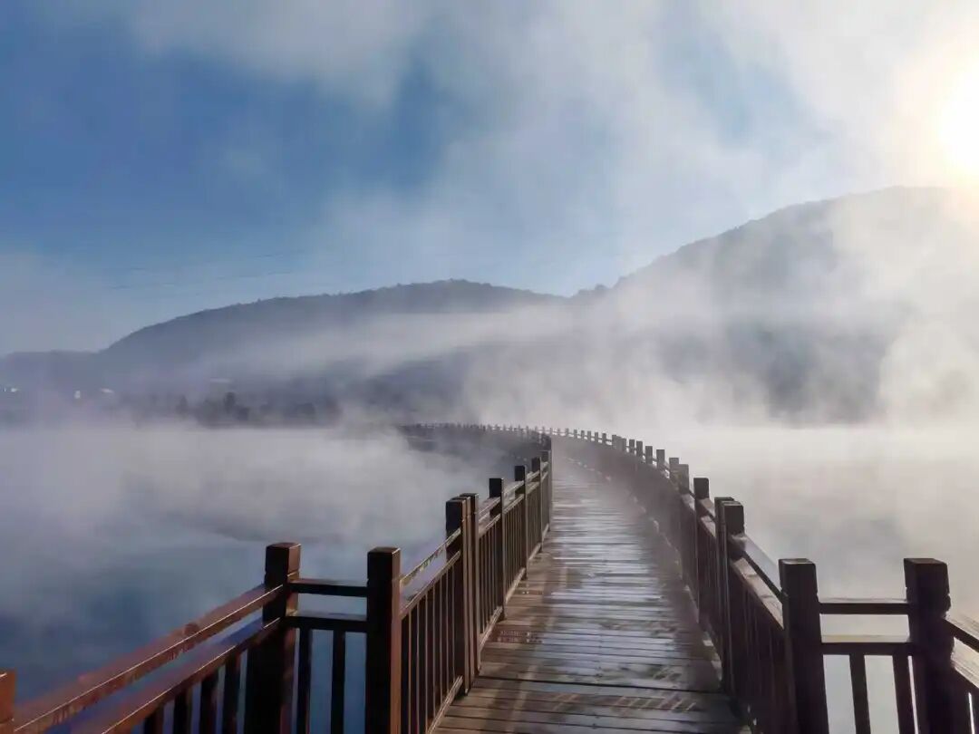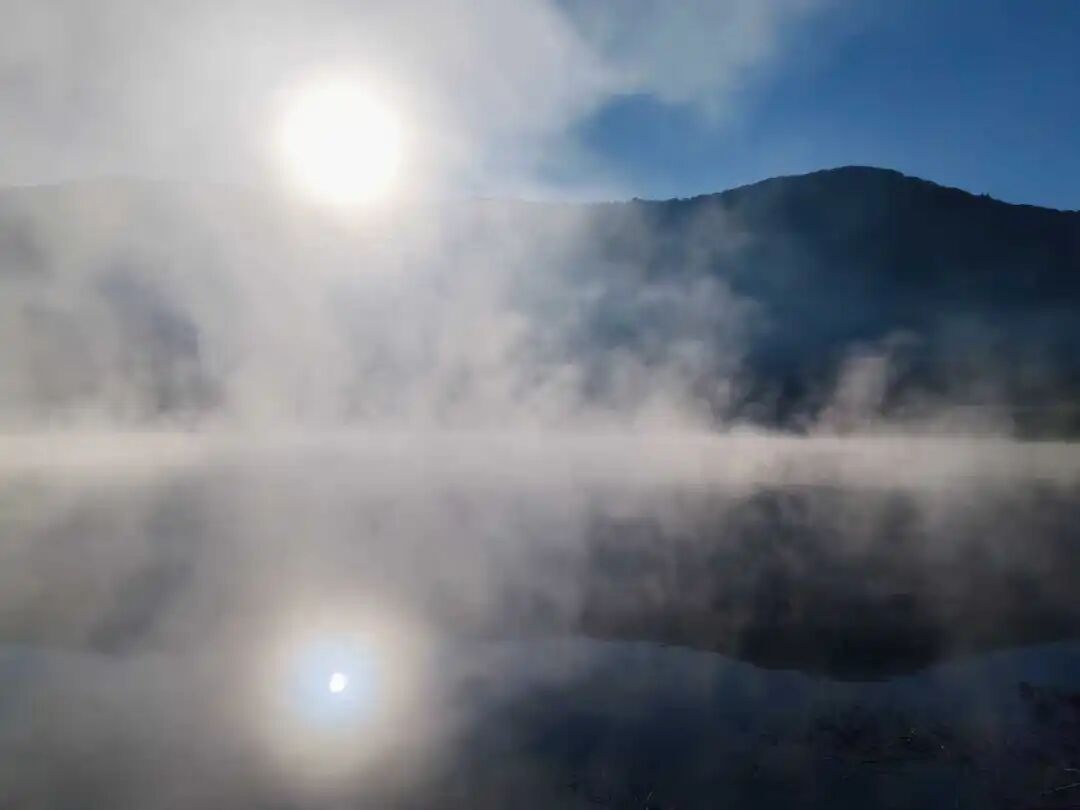 村前湖面上,蒸腾的水汽与弥散的雾霭交融,丝丝缕缕,浓淡飘忽——时而缠绕老槐苍劲的枝干,时而低伏镜面般的湖心,恍若天宫瑶池的碎玉坠入凡尘,在人间铺展成流动的诗篇。