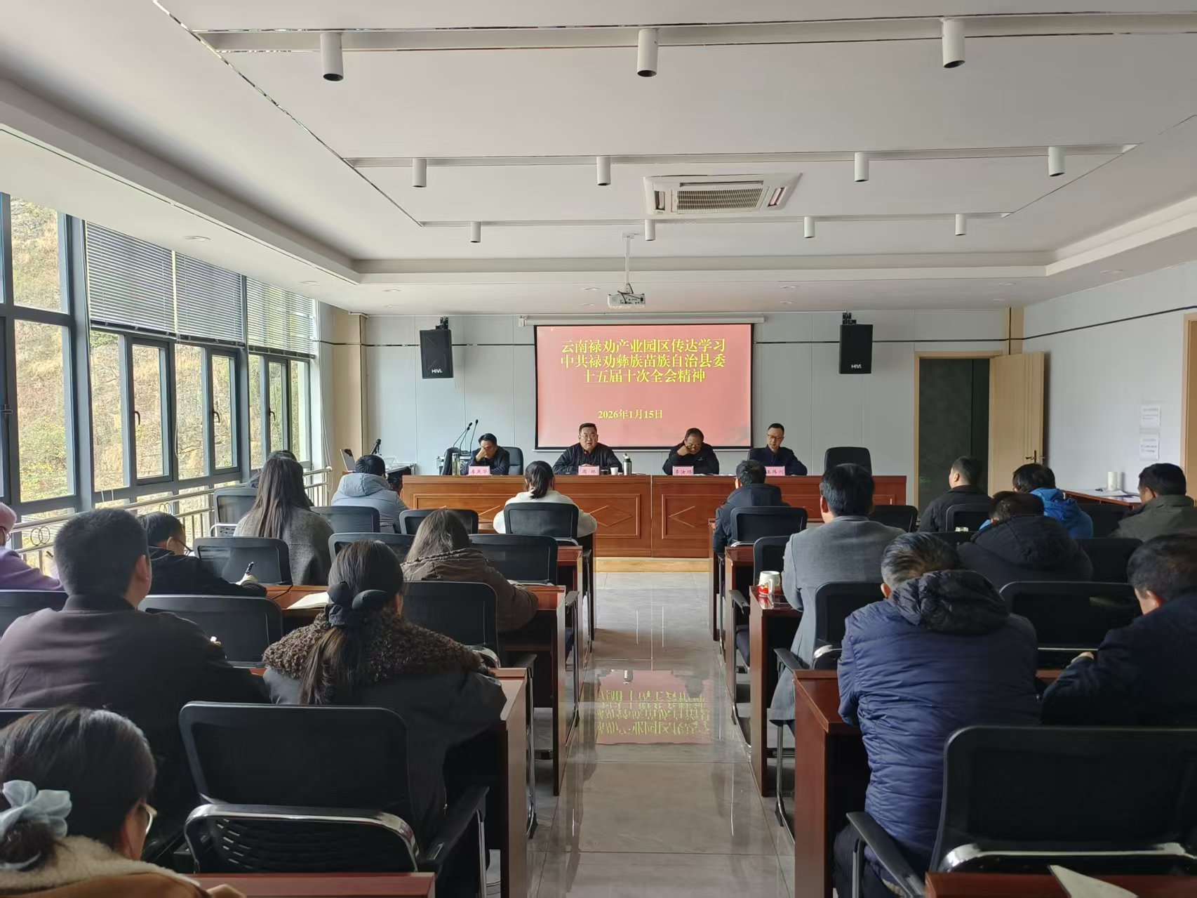 1月15日,云南禄劝产业园区召开全体干部职工会议传达学习县委十五届十次全会精神,园区党工委班子成员、全体干部职工参加会议。
